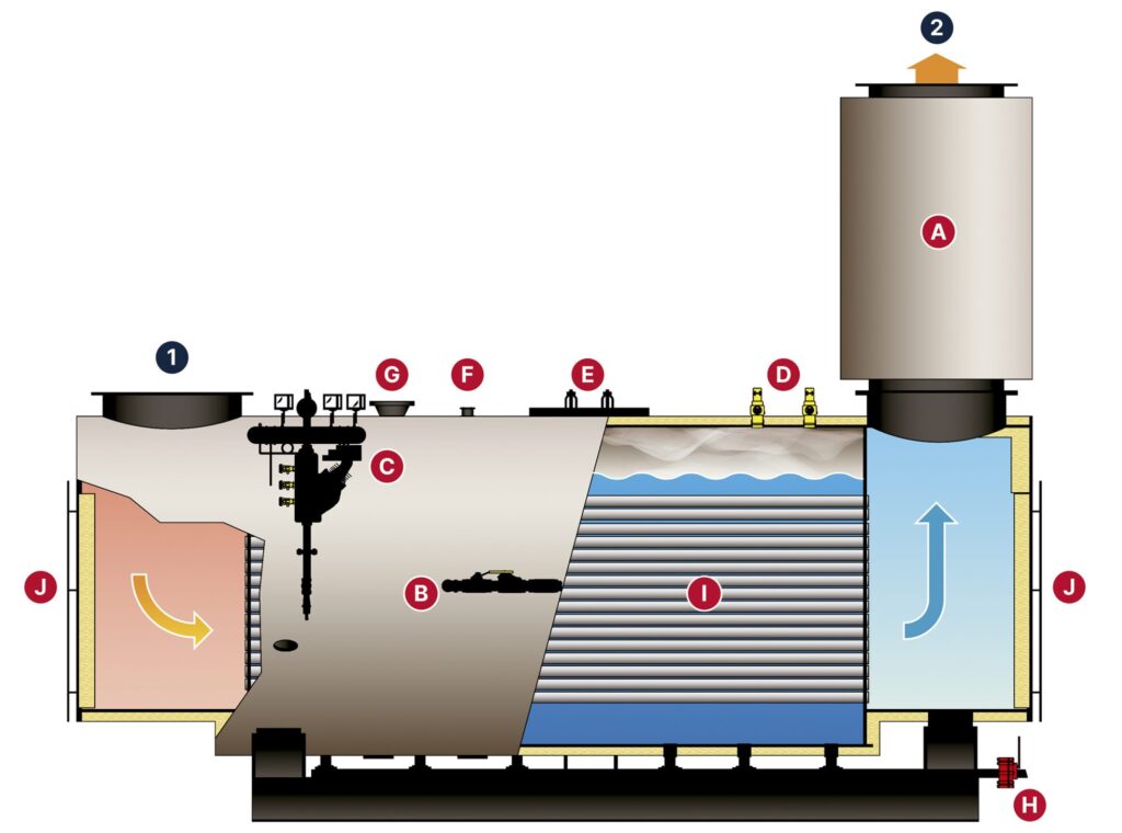 A. Economizador. B. Alimentación de agua. C. Columna de nivel. D. Válvulas de seguridad. E. Pasa hombre. F. Segundo control de nivel. G. Salida de vapor. H. Purgas de fondo. I. Tubos flux. J. Accesos de mantenimiento.